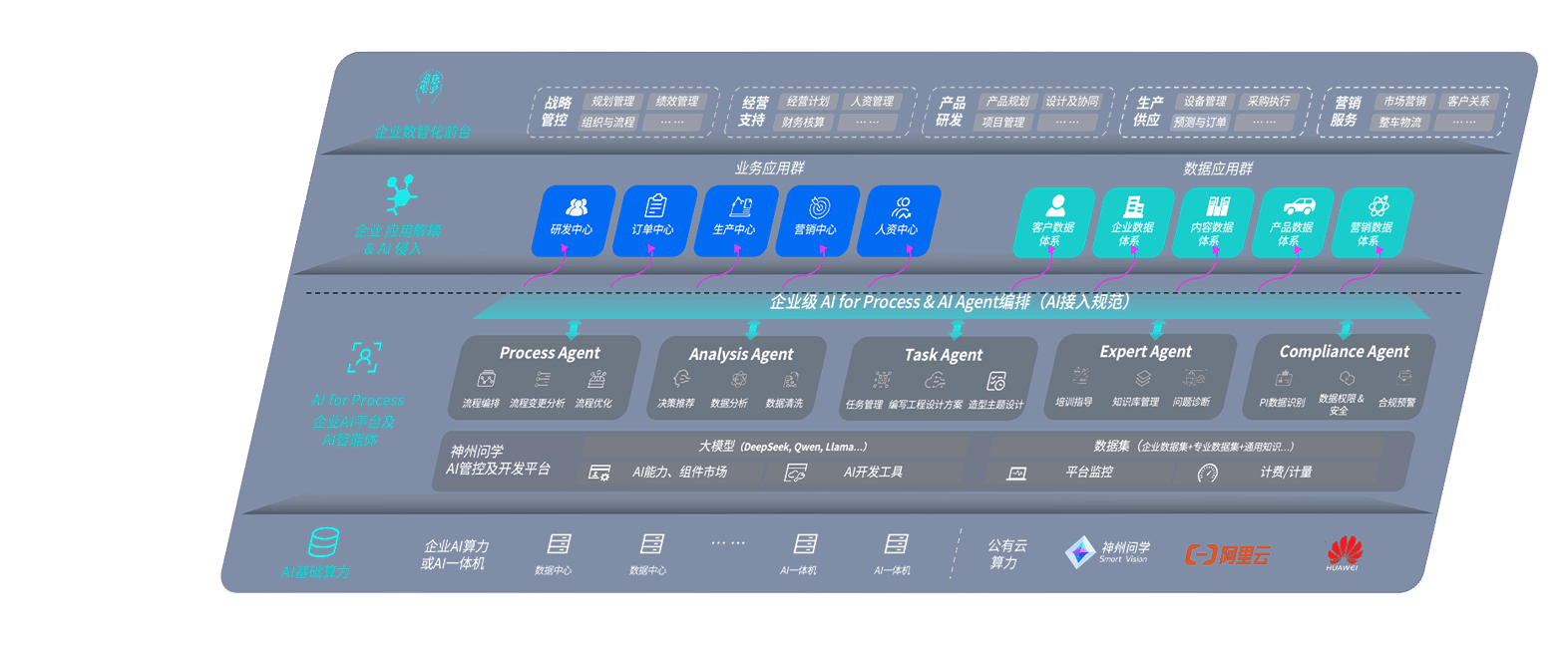 意昂2问学智车解决方案是一套基于AI技术的汽车行业智能化系统,,覆盖从底层算力到顶层AI应用的全栈方案。。。。方案由算力层、、、、模型层和应用层组成:算力层,,,方案支持多种一体机配置,,具备云端灵活部署、、、多云适配以及动态优化计算资源的能力;模型层,,,意昂2问学平台版提供了企业级AI应用一站式构建与管理平台,,,支持基于后训练强化技术的汽车企业专属模型的训练、、、评测和运营;应用层,,意昂2问学DeepSeek版提供包括超级员工、、、智能招采、、、智能营销、、、、智能客服、、AI for BI等一系列解决方案,,,可助力汽车行业实现数字化转型,,让管理更智能、、响应更敏捷。。