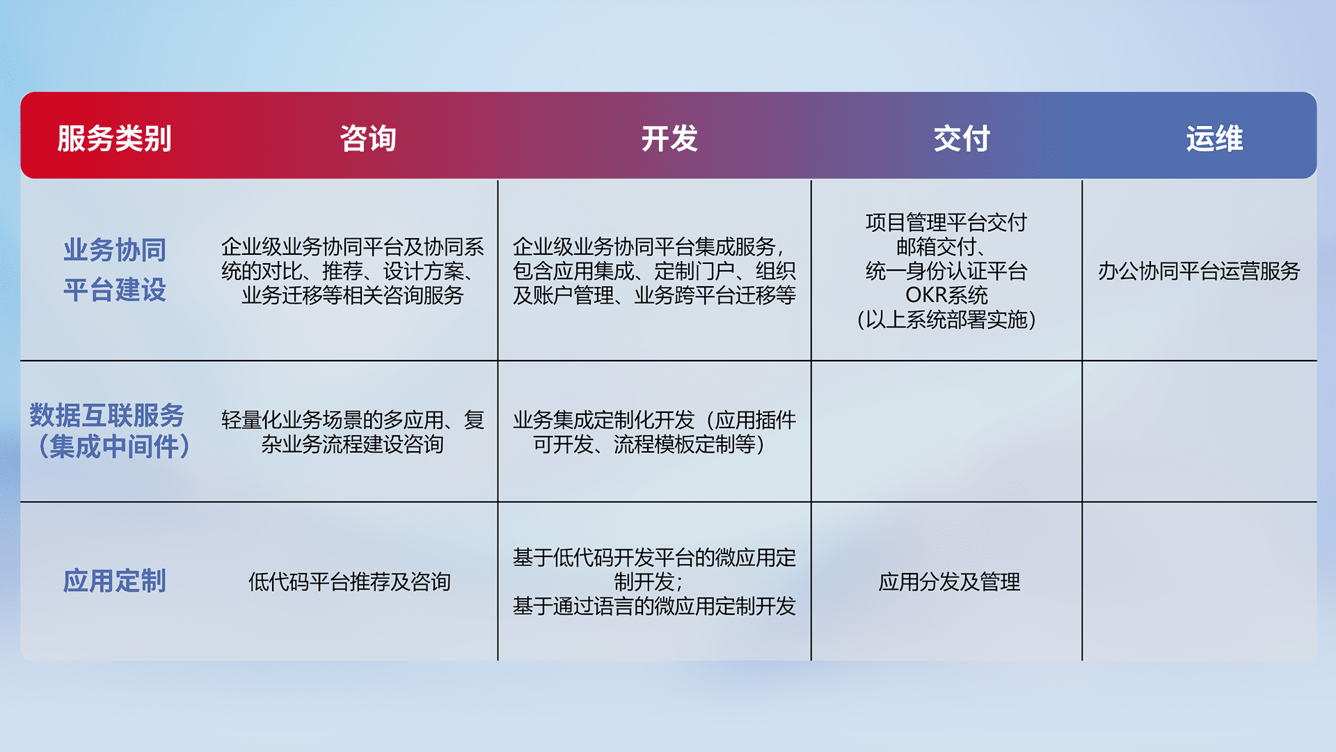 针对钉钉、、、、企微、、、、IDaas等平台级产品提供产品的规划、、、方案、、交付、、定制化开发等服务,,实现如统一协同办公、、、、智能客户服务、、混合会议管理、、、、智能数据查询、、、、等业务场景,,,实现数字化转型。。