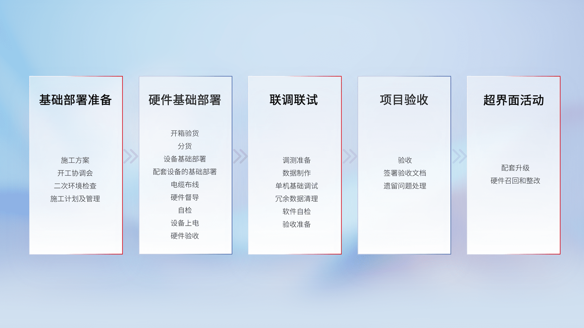 从基础部署准备、、、、硬件基础部署、、、、联调联试、、项目验收、、、越界面活动的全过程可追溯,,保证施工质量和进度。。
